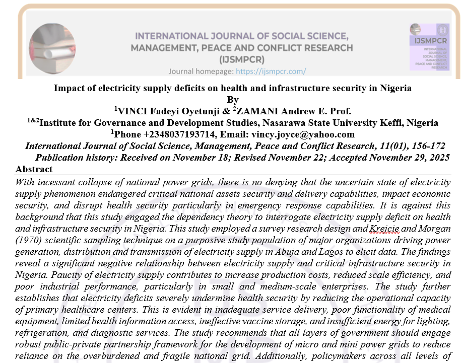With incessant collapse of national power grids, there is no denying that the uncertain state of electricity supply phenomenon endangered critical national assets security and delivery capabilities, impact economic security, and disrupt health security particularly in emergency response capabilities. It is against this background that this study engaged the dependency theory to interrogate electricity supply deficit on health and infrastructure security in Nigeria. This study employed a survey research design and Krejcie and Morgan (1970) scientific sampling technique on a purposive study population of major organizations driving power generation, distribution and transmission of electricity supply in Abuja and Lagos to elicit data. The findings reveal a significant negative relationship between electricity supply and critical infrastructure security in Nigeria. Paucity of electricity supply contributes to increase production costs, reduced scale efficiency, and poor industrial performance, particularly in small and medium-scale enterprises. The study further establishes that electricity deficits severely undermine health security by reducing the operational capacity of primary healthcare centers. This is evident in inadequate service delivery, poor functionality of medical equipment, limited health information access, ineffective vaccine storage, and insufficient energy for lighting, refrigeration, and diagnostic services. The study recommends that all layers of government should engage robust public-private partnership framework for the development of micro and mini power grids to reduce reliance on the overburdened and fragile national grid. Additionally, policymakers across all levels of government are urged to design specific energy policies prioritizing healthcare facilities, particularly in rural areas. The mandatory deployment of renewable energy solutions in healthcare centers is emphasized as a sustainable approach to mitigate the adverse effects of electricity supply deficits on health security